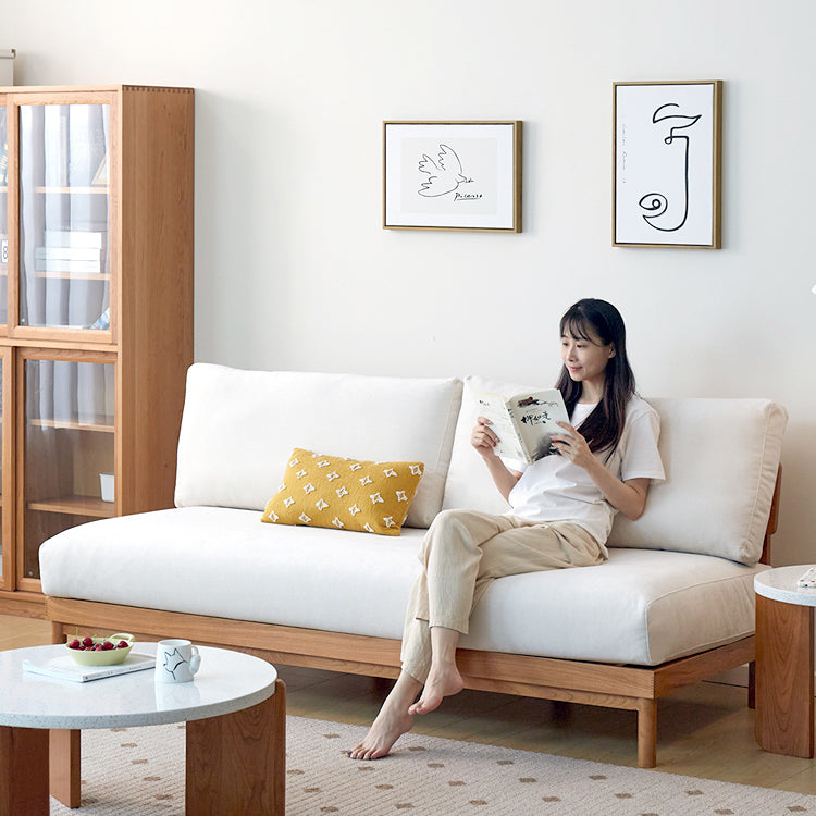 Luxurious White & Gray Sofa with Cotton-Linen Blend and Cherry Wood Accents fcp-1287