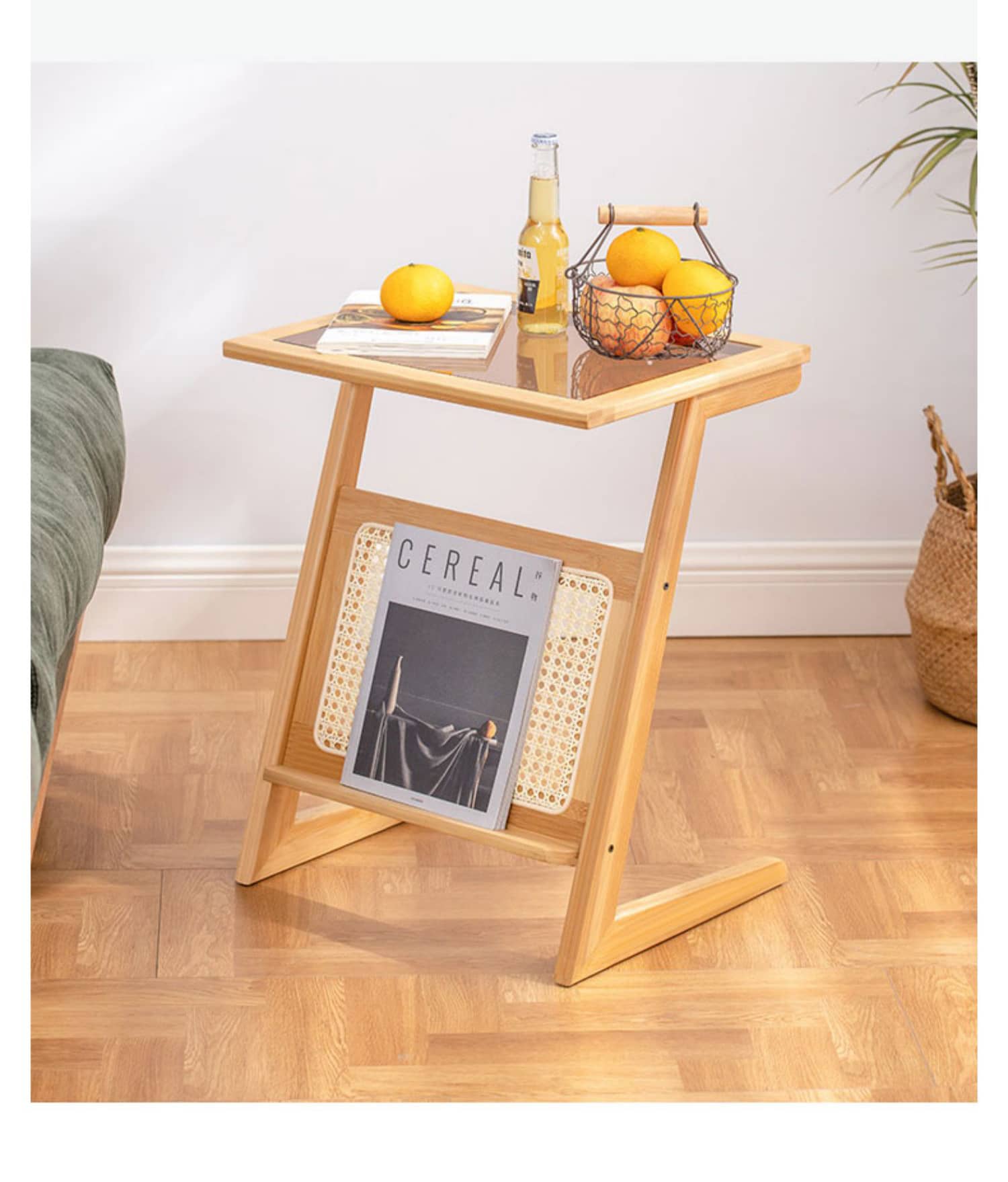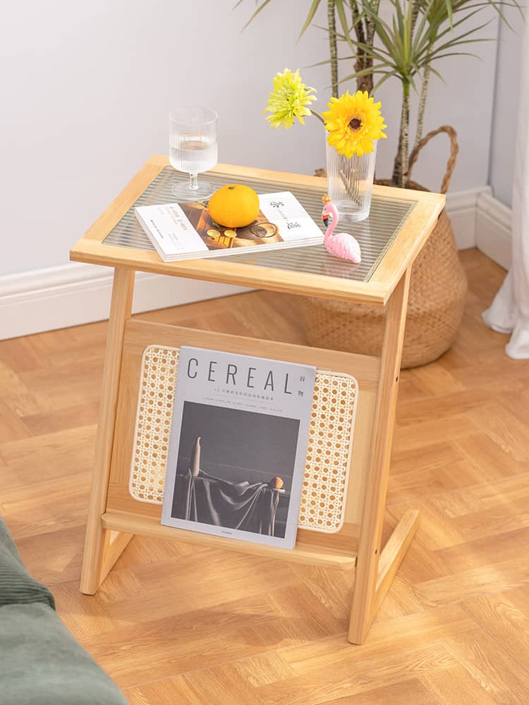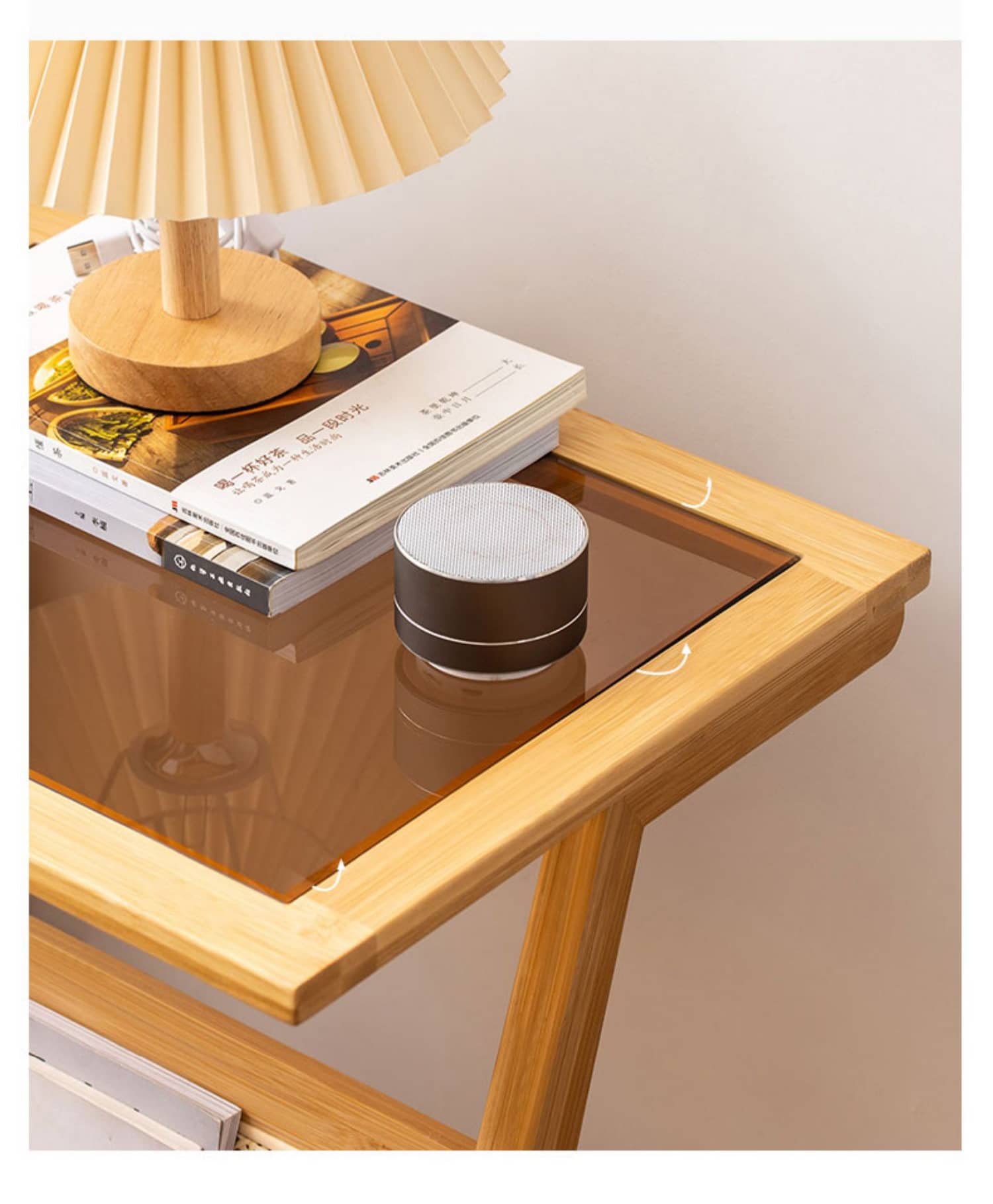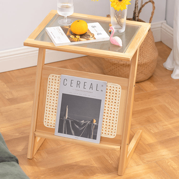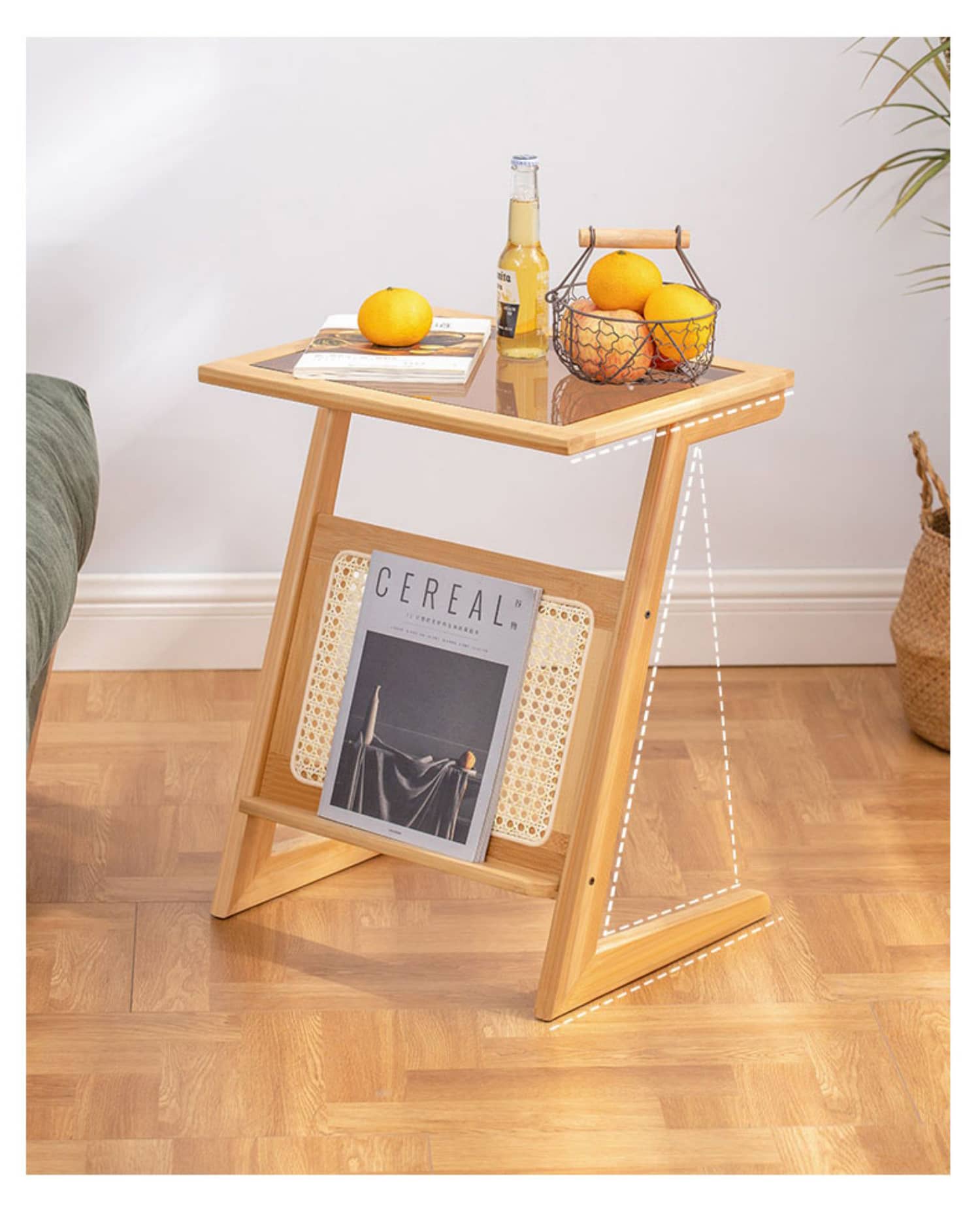Stunning Natural Wood Tea Table with Intricate Bamboo and Rattan Weaving - Reeded Glass Top in Elegant Brown Grey hsl-84
